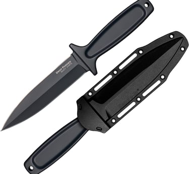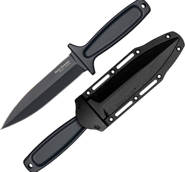 This blade seems like it was going for the old school frog man / divers dagger worn around the ankle. Dual edge with a serrated section on one side.