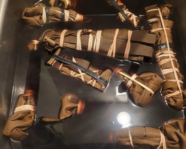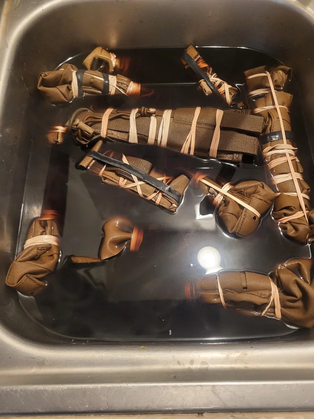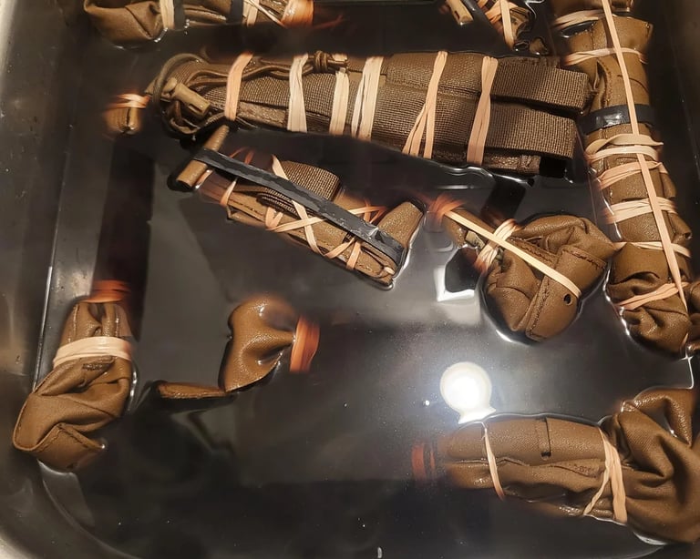 Judging when to pull your pouches was the more challenging part, at least for me anyhow. The material fresh out of the bath is much darker than how they look when fully dry. Again, in my limited experience in this matter, the finial product ends up being about 70% lighter shade of whatever color your using, brown in this case. Once you do decide to pull the pouches, you need to make sure and give them a solid renicing before you lay them out to dry. I prefer to drop them straight into a soapy water bath for at least 5 minutes & then again in just plain water. I'm sure there are multiple reasons for this but the main one for me is to reduce the smell it leaves behind. The smell isn't extreme & does fade over time fairly quickly so it's nothing to put a ton of thought into, but I have a very sensitive nose, so this step is just quality of life. Last bit is just to dry the pouches out. Best way to do this is by hang drying them in a nice hot environment. Don't toss them into a dryer unless you want them highly damaged or destroyed.