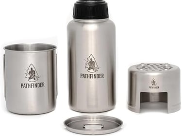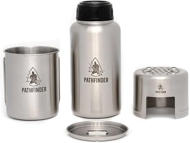 The Pathfinder Canteen Set comes with a 32oz single walled canteen, stove, & a nesting cup with lid. A personal favorite & trusted canteen by thousands.