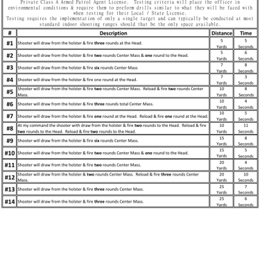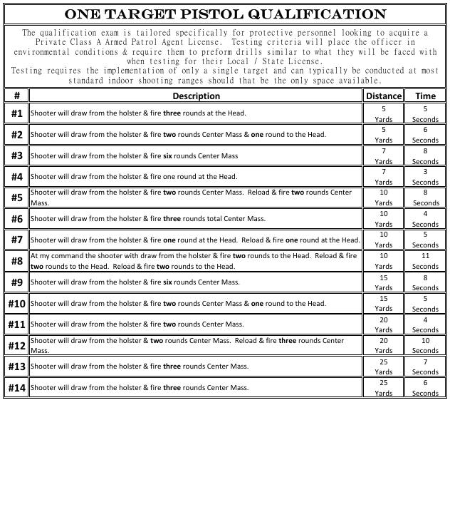 The qualification exam is tailored specifically for protective personnel looking to acquire a Private Class A Armed Patrol Agent License. Testing criteria will place the officer in environmental conditions & require them to preform drills similar to what they will be faced with when testing for their Local / State License. Testing requires the implementation of only a single target and can typically be conducted at most standard indoor shooting ranges should that be the only space available.